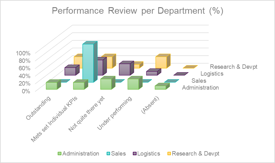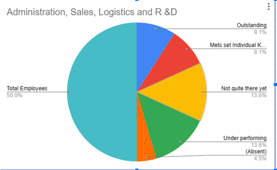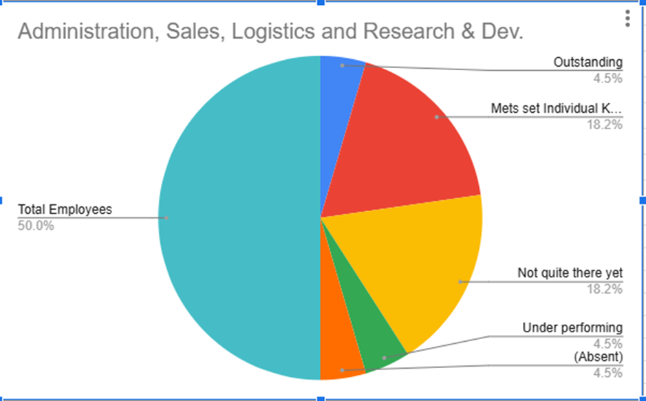 Of the four departments, the research and development team has demonstrated the most exceptional level of achievement. All individuals within the sales team achieved their personal performance goals. However, some departments still include employees whose performance does not yet meet the expected standards.