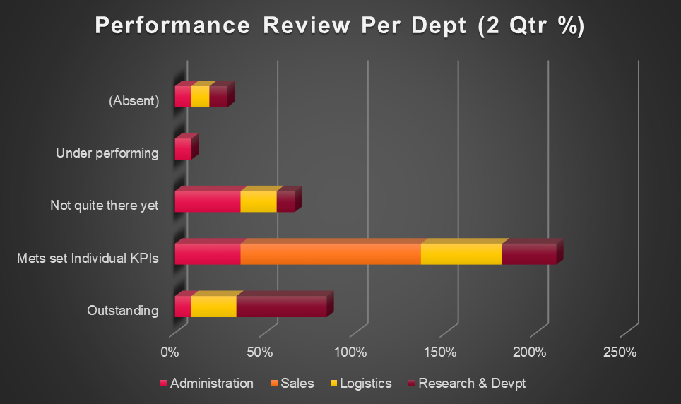During the second quarter, every employee in the sales department not only met but exceeded their individual KPIs. In contrast, the administrative department reported a significant number of staff members falling short of the expected performance standards.